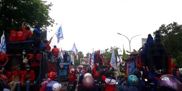 Telusur.co.id - SURABAYA, Aksi demo menolak pengesahan Omnibus Law undang-undang Cipta Kerja terus bergulir. Ribuan buruh dari